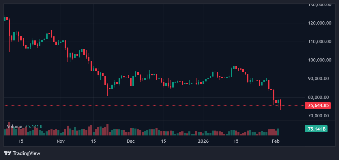 BTC briefly dipped below US$73,000 (AU$111K), erasing gains since Donald Trump’s November 2024 re-election. The coin is down more than 40% from its early-October peak, according to CoinMarketCap data.